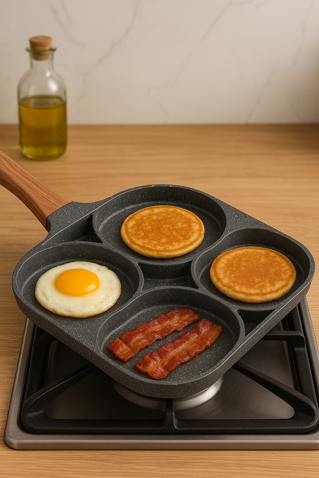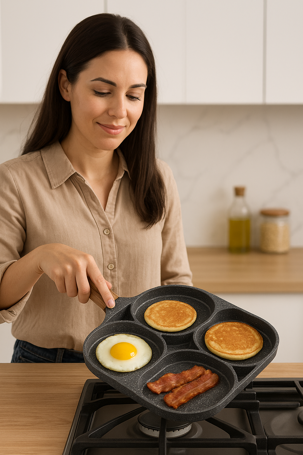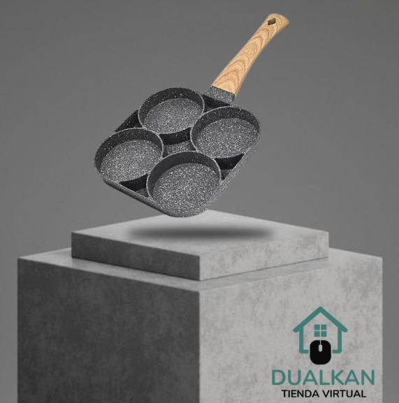 Prepara huevos, pancakes, arepas, hamburguesas y mucho más al mismo tiempo con este sartén antiadherente de piedra. Su diseño de 4 cavidades te permite cocinar rápido, sin que los alimentos se peguen y con menos aceite. ¡Ideal para desayunos prácticos y saludables!